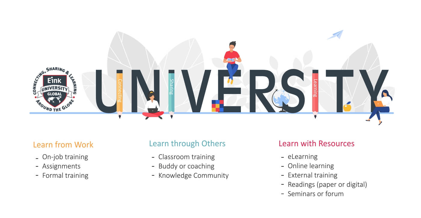 Inkers are also encouraged to seek learning opportunities or resources by themselves with assistance from E Ink University through specialized external courses, books, articles and pod-casts.