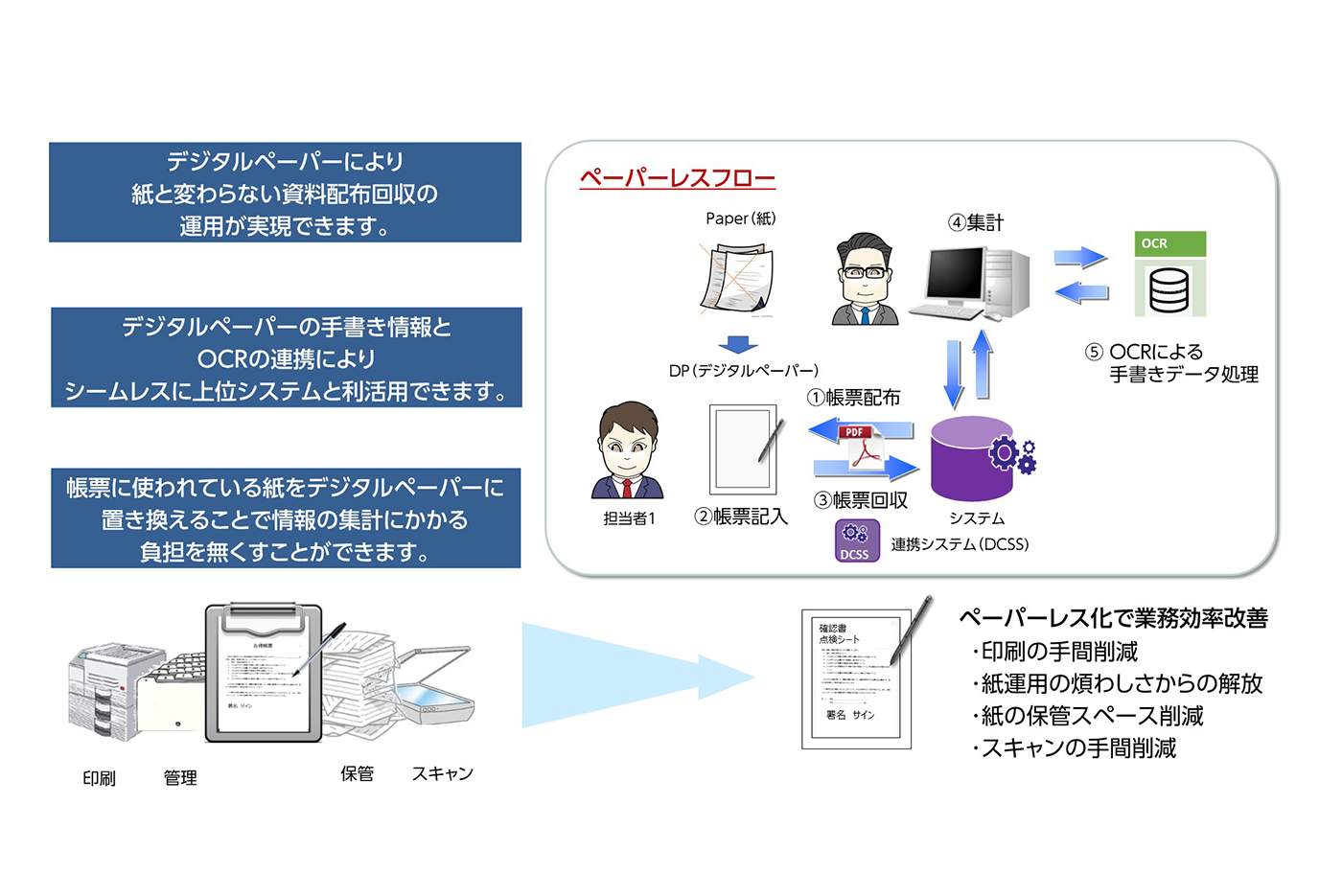 Web APIを利用することで、お客様でお使いのシステムから、デジタルペーパー端末をシームレスに接続することができ、従来の紙業務ワークフローのデジタル化(DX化)に貢献します。