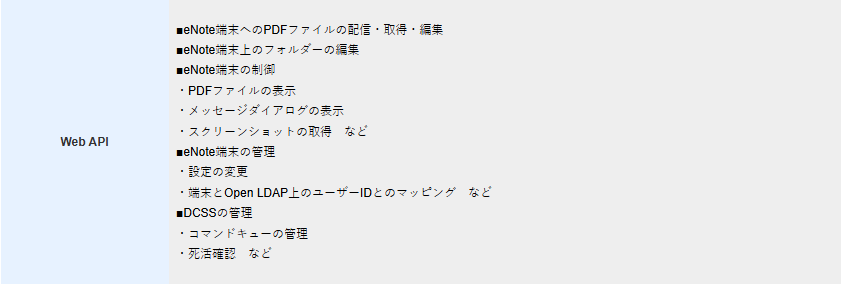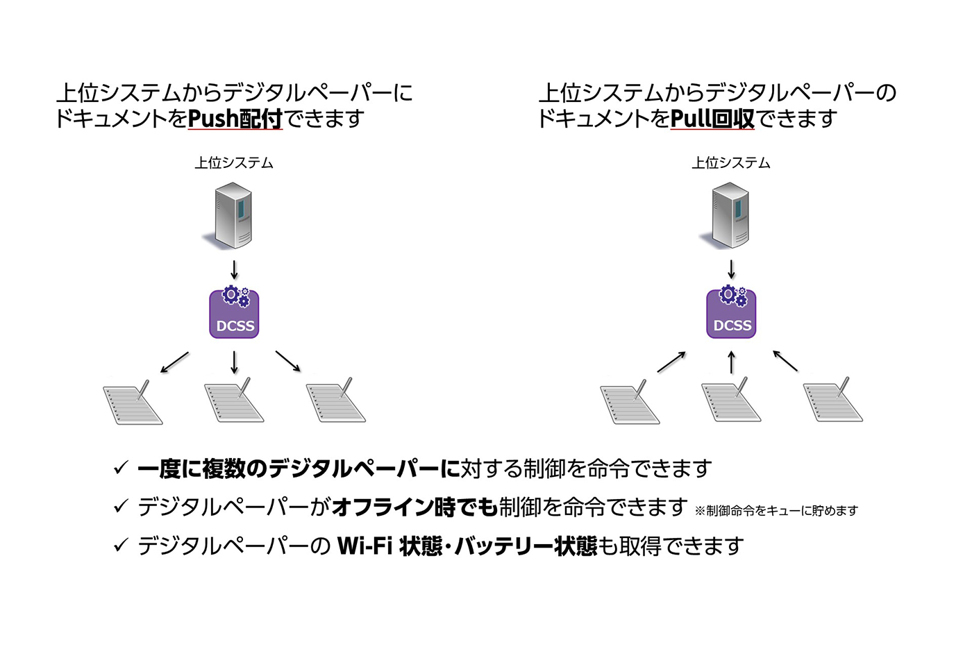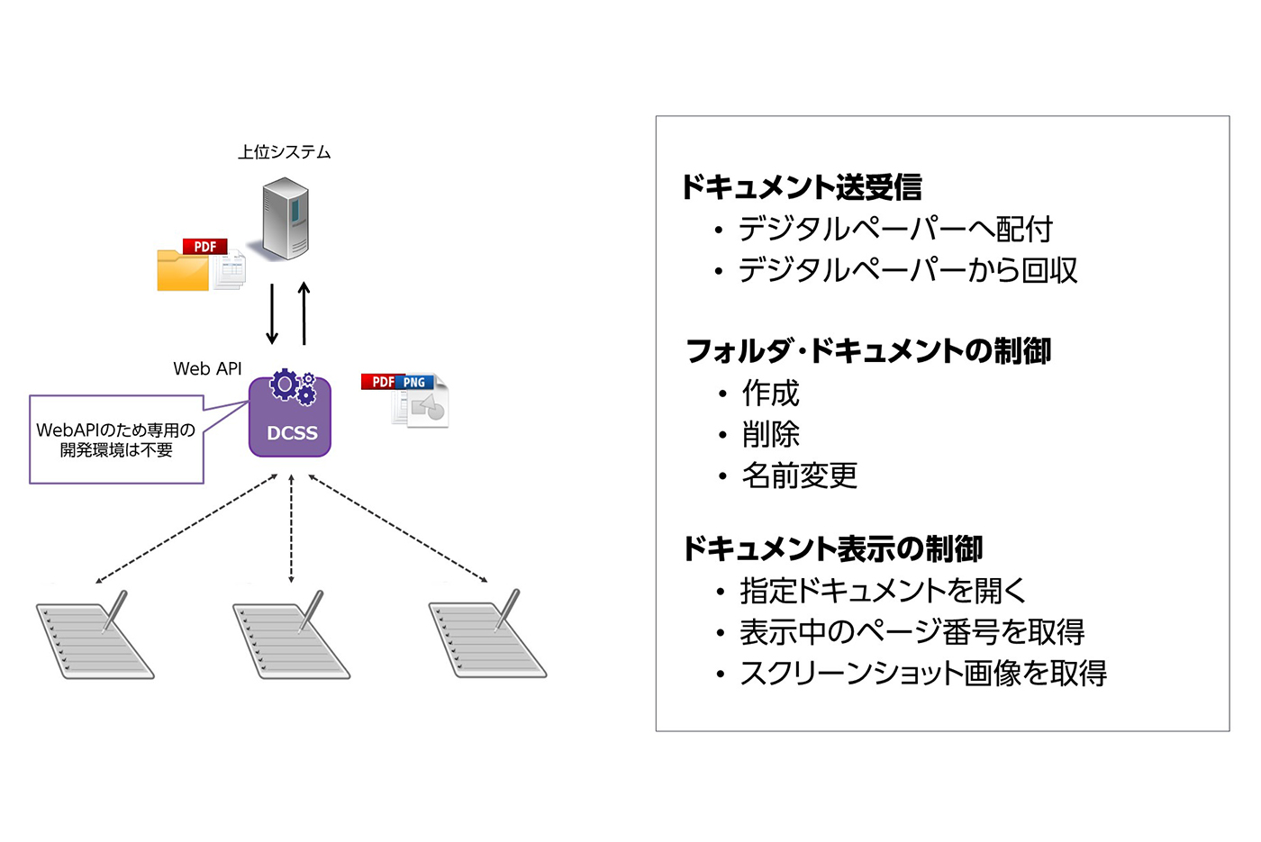 HTTPベース (REST形式) の WebAPI を利用してデジタルペーパーと上位システムの連携開発を可能とするミドルソフトウェア(DCSS)を提供します。